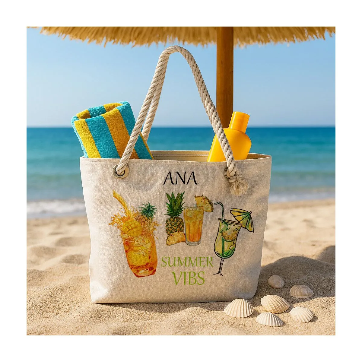 Pregătește-te pentru zile de neuitat pe plajă cu această geantă de plajă personalizată cocktail, un accesoriu esențial pentru vacanțele tale. Fabricată din materiale rezistente și ușor de întreținut, geanta îți va păstra toate lucrurile de care ai nevoie în vacanță – de la prosoape și cremă de protecție solară până la cartea preferată sau sticla de apă.