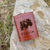 Sticla de buzunar personalizata cu nume si 3 stele este îmbrăcată în piele de culoare maro închis.