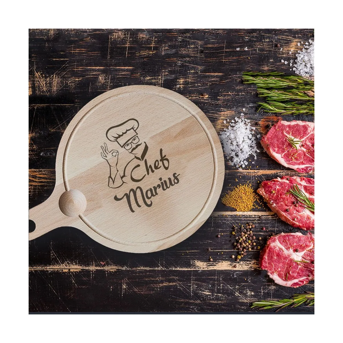 Arată-le persoanelor dragi ție cât de mult le apreciezi talentul in ale gătitului oferindu-le acest tocator rotund cu maner personalizat si nume.
